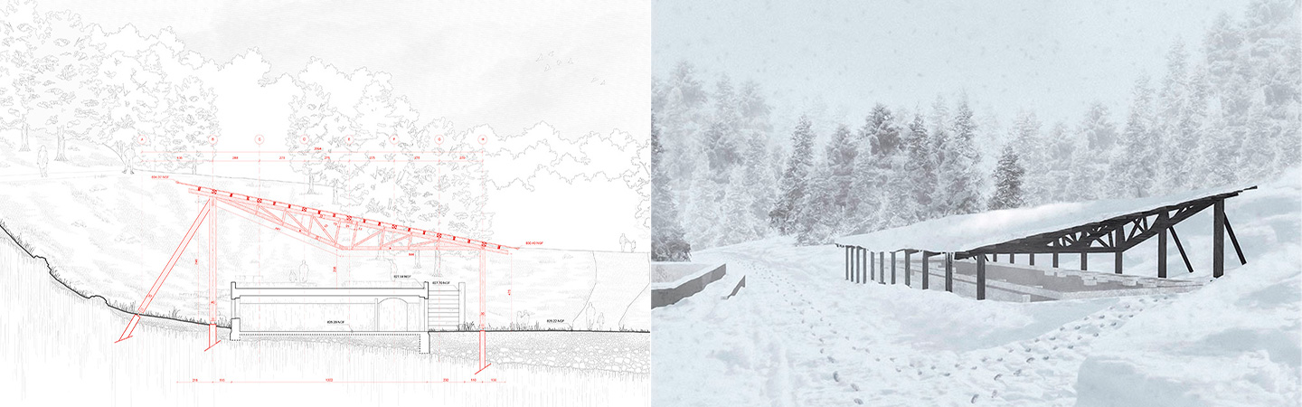 À gauche : des étudiants de l’École nationale supérieure d’architecture de Clermont-Ferrand et de l’Université de Lübeck (Allemagne) ont conçu le projet retenu par l’architecte en charge, l’ONaCVG et la DRAC.